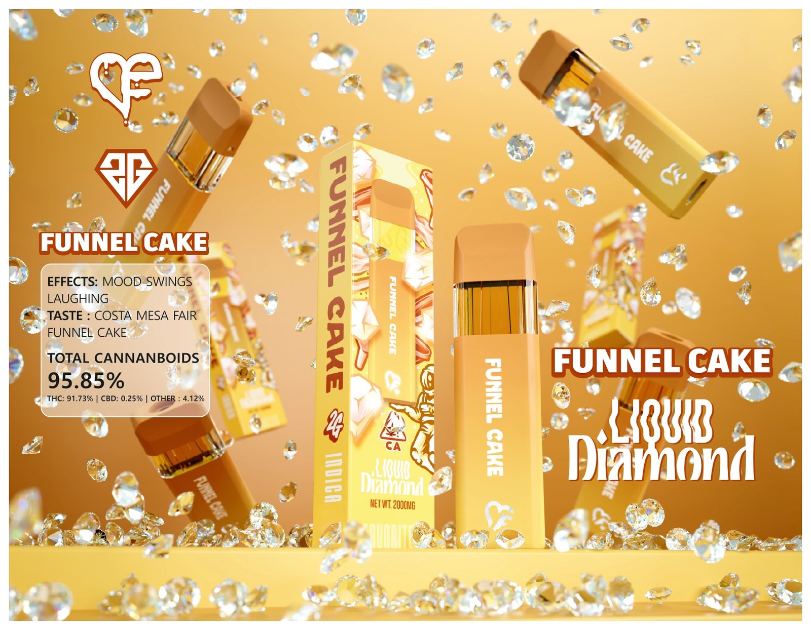 The Funnel Cake Liquid Diamond flavor captures the taste of golden-fried dough dusted with powdered sugar. On the inhale, users experience warm, pastry-like sweetness with subtle vanilla notes. The exhale delivers a smooth, sugary finish that mimics the comforting taste of a classic fairground treat.