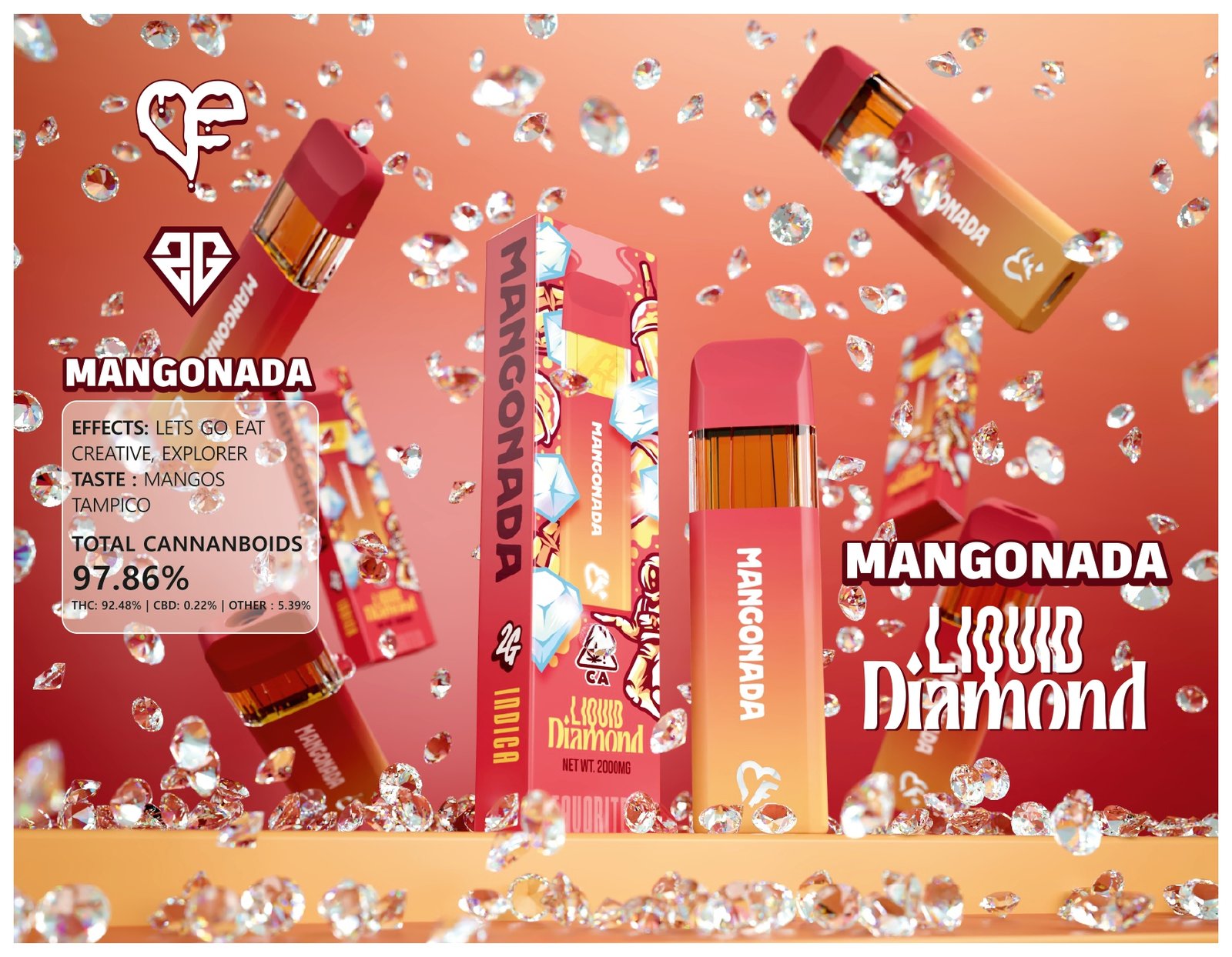 The Mangonada Liquid Diamond disposable is made using high-quality Liquid Diamond concentrate, an advanced extraction process designed to preserve flavor clarity, cannabinoid purity, and smoothness. Unlike standard distillate vapes, Liquid Diamond delivers cleaner vapor, reduced harshness, and consistent flavor from the first puff to the last.